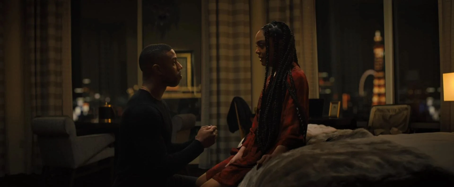 Upon winning the championship, Adonis decides it's the right time to propose to Bianca. Adonis seeks advice from Rocky, but it doesn't seem to help his nerves. Finally, Adonis pops the question to Bianca in the hotel room, and she says yes. Bianca suggests to Adonis that they could start a new life in Los Angeles, begin building their family. Adonis is reluctant at first, not wanting to leave Rocky behind, but he agrees to think about it.