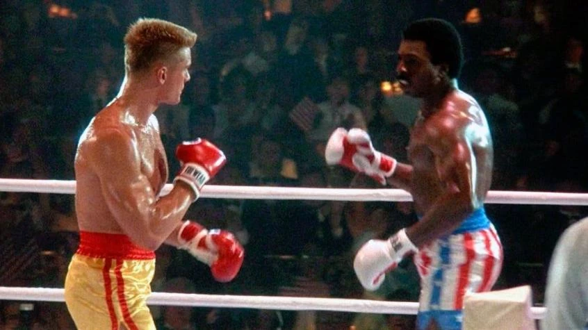 Unknown to Drago, the ring rose up from underground and into the arena with him standing in it. The ring came up while the song "Living in America" was being performed by James Brown and Apollo Creed was making an elaborate entrance with his Uncle Sam outfit like in the first movie, dancing his way around all the showgirls, dancers and James Brown. Creed continued showboating to the crowd and dancing around before finally entering the ring as James Brown finished the song. It was predicted by the majority of sports analysis that Apollo would defeat Ivan because of his outweighing experience and his ability to win under pressure. With Rocky, Duke and Paulie in his corner, Apollo was overly confident that he could dispense of Drago with ease. The audience erupted for the true champion Rocky Balboa of defining the word "Courage" as the announcement presence after defeating Clubber Lang of avenging Mickey Goldmill from the previous movie and for the introduction of Creed while the crowd boos at Drago with Apollo taunting him "I want you! I want you!". The two fighters met in the middle of the ring with the referee Lou Filippo going over the rules, Creed seemed confident and excited as he tells Drago "It's time to go to school"! They then touched gloves with Creed slamming into Ivan's and says "You will lose", which causes Creed's expression to become more worrying.